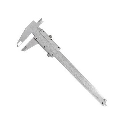Calibro ventesimale in acciaio. Range di misura 15 cm. Vite di bloccaggio. Asta per misure di profondità. Venduto con custodia.