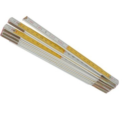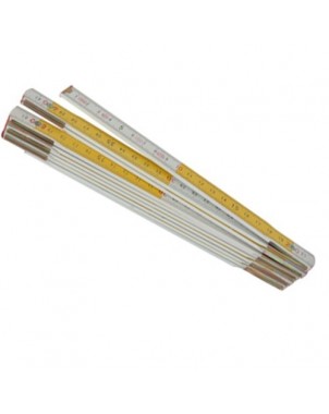 Doppiometro in legno con giunture metalliche rinforzate, graduate. Colore bianco / giallo. Lunghezza 2 metri.